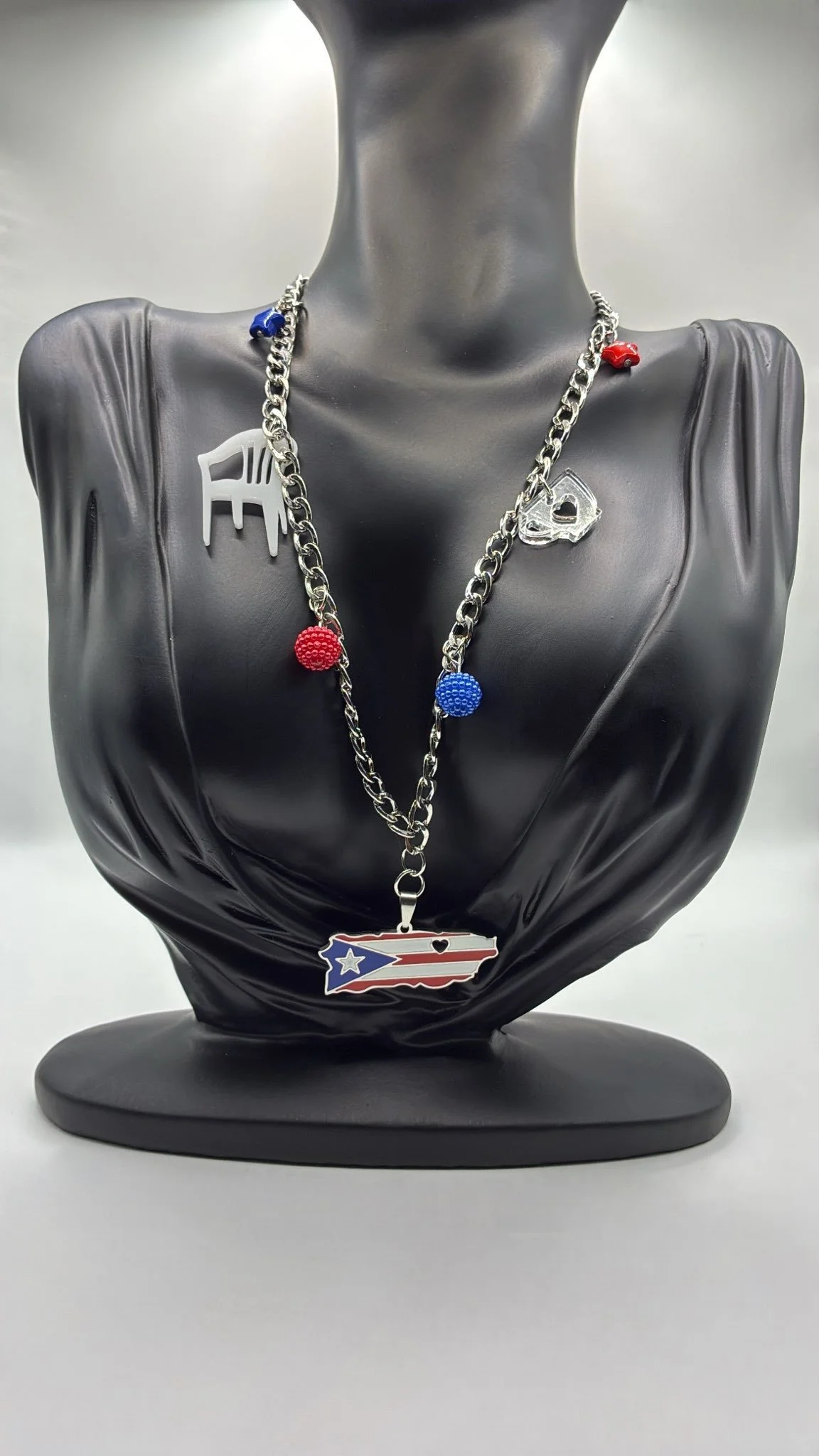 Carry Puerto Rico close to your heart with the La Isla Necklace, a bold statement piece that celebrates culture, strength, and heritage. Featuring a pendant shaped like the island with the Puerto Rican flag design, this necklace is accented with vibrant red and blue textured beads along a sturdy silver-toned chain.