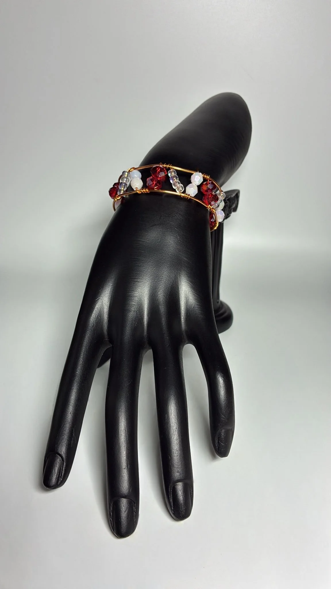 Bold yet elegant, the Ruby Gleam bracelet is a radiant statement piece designed to capture attention. Handcrafted with warm copper wire, it features striking ruby-red beads paired with luminous white and clear iridescent accents. The vibrant red symbolizes passion and love, while the shimmering white and clear tones add balance and light, creating a bracelet that shines with timeless beauty.